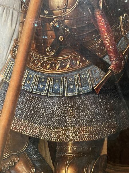 甲冑部分のアップまず目を奪われたのは、向かって右奥に描かれた依頼主の守護聖人である聖ゲオルギウスの甲冑です。