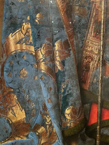 左側にはブルッヘ聖堂参事会の守護聖人である聖ドナトゥス。衣に織り込まれた金糸が光を受けて細かく輝き、その立体感と存在感を際立たせています。